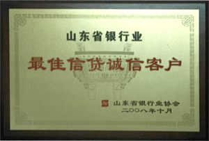 ·2008年10月,被評為:山東省銀行業(yè)最佳信貸誠信客戶